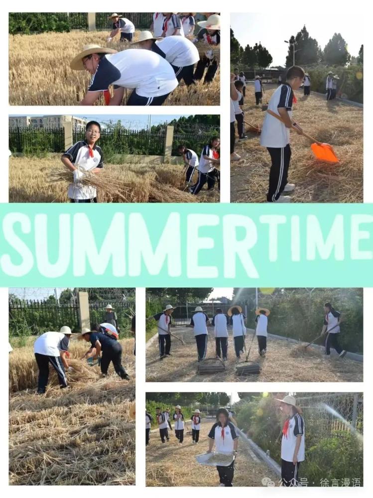 一大早,后勤就在为收获忙碌着:草帽、镰刀、碌碡……该有的工具一样不少。下午,初一学生就在老师的带领下走入麦田,开启全新的劳动体验。
